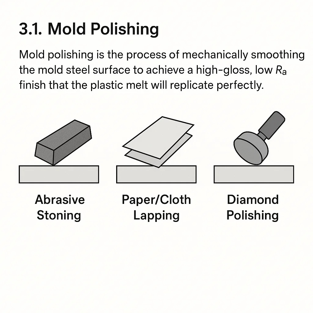 - ছাঁচ পলিশিং: মিরর-ফিনিশ পার্টস (এসপিআই এ-গ্রেড) এর জন্য ডায়মন্ড পেস্ট বা ঘষিয়া তুলিয়া ফেলিতে সক্ষম পাথর ব্যবহার করে যথার্থ পলিশিং প্রয়োজন।