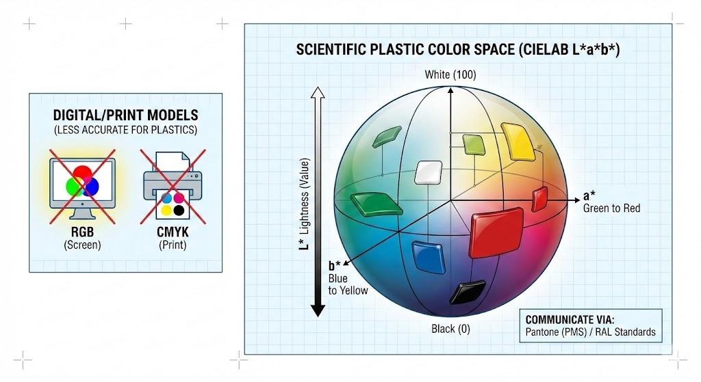 যন্ত্রের মধ্যে ডুব দেওয়ার আগে, প্লাস্টিকের মতো একটি ভৌত, ত্রিমাত্রিক মাধ্যমে রঙ কীভাবে কাজ করে তা বোঝা গুরুত্বপূর্ণ। অনেক ডিজাইনের ত্রুটি ঘটে কারণ স্টেকহোল্ডাররা ডিজিটাল রঙের মডেলগুলির উপর নির্ভর করে যা শারীরিক উত্পাদনে ভালভাবে অনুবাদ করে না।