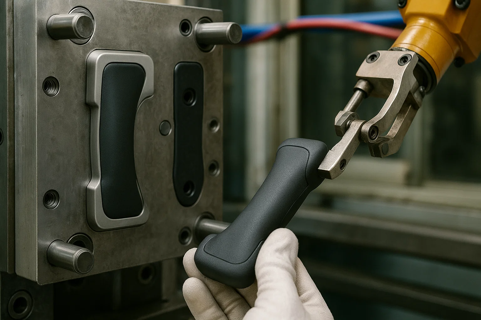 সমাধান: প্রস্তুতকারক প্রয়োগ করা হয়েছে ওভারমোল্ডিং একটি দুটি শট ইনজেকশন ছাঁচনির্মাণ প্রক্রিয়া ব্যবহার করে। প্রথমত, স্ট্রাকচারাল হ্যান্ডেল বডিটি একটি টেকসই, অনমনীয় এবিএস প্লাস্টিক থেকে ed ালাই করা হয়েছিল। এই অনমনীয় "সাবস্ট্রেট" এর পরে একই ছাঁচনির্মাণ মেশিনের মধ্যে দ্বিতীয় গহ্বরের দিকে ঘোরানো হয়েছিল। এখানে, একটি নরম, ইলাস্টোমেরিক থার্মোপ্লাস্টিক ভলকানাইজেট (টিপিভি) এবিএস হ্যান্ডেলের নির্দিষ্ট ক্ষেত্রগুলিতে ইনজেকশন দেওয়া হয়েছিল, এটি একটি আরামদায়ক, নন-স্লিপ গ্রিপ গঠন করে।