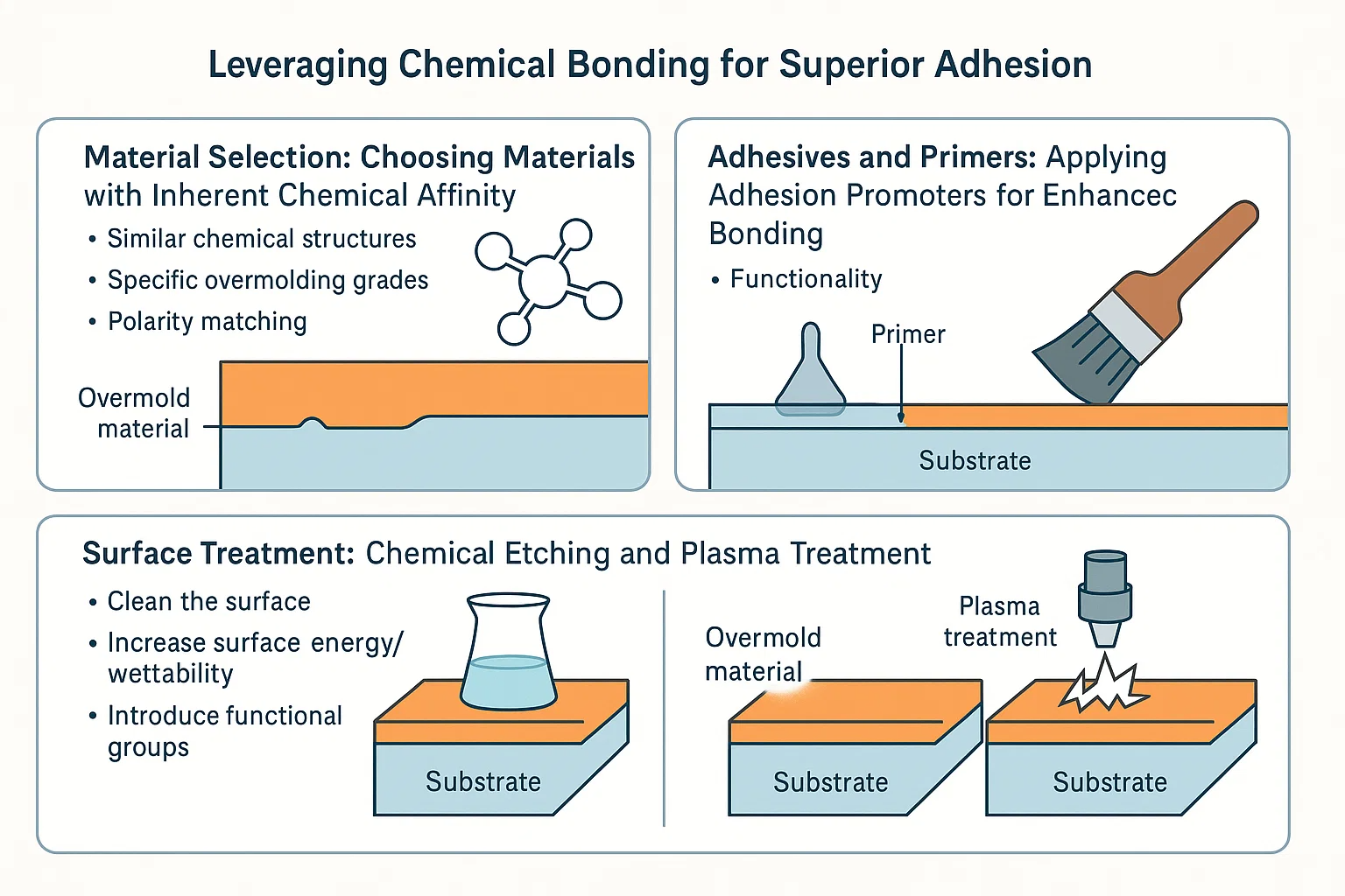এমনকি রাসায়নিকভাবে সামঞ্জস্যপূর্ণ উপকরণ সহ, পৃষ্ঠের দূষক বা নিম্ন পৃষ্ঠের শক্তি বন্ধনকে বাধা দিতে পারে। বিভিন্ন পৃষ্ঠের চিকিত্সাগুলি রাসায়নিক মিথস্ক্রিয়ায় আরও গ্রহণযোগ্য হতে সাবস্ট্রেটকে প্রস্তুত করতে পারে।