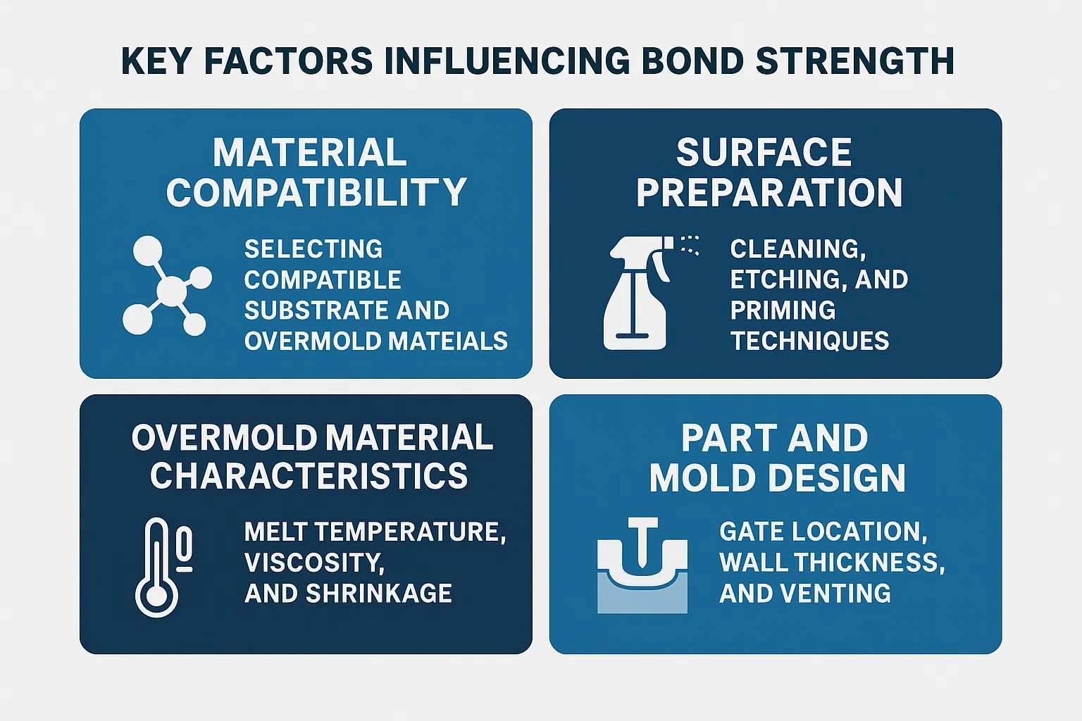 ওভারমোল্ডিংয়ে একটি উচ্চতর বন্ধন অর্জন কেবল বিজ্ঞান বোঝার বিষয়ে নয়; এটি পুরো নকশা এবং উত্পাদন প্রক্রিয়া জুড়ে বেশ কয়েকটি ব্যবহারিক কারণ নিয়ন্ত্রণ করার বিষয়ে। এর মধ্যে যে কোনও একটিকে অবহেলা করা চূড়ান্ত বন্ড শক্তিকে উল্লেখযোগ্যভাবে আপস করতে পারে।