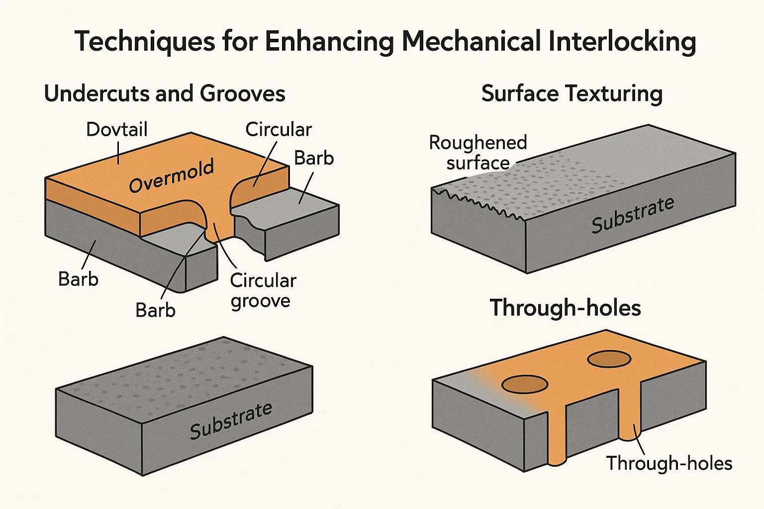 সাবস্ট্রেটের মধ্যে মাইক্রোস্কোপিক হুক বা অ্যাঙ্কর হিসাবে আন্ডারকাট এবং খাঁজগুলি ভাবেন। যখন গলিত ওভারমোল্ড উপাদানগুলি এই বৈশিষ্ট্যগুলিতে প্রবাহিত হয় এবং শীতল হয়, তখন এটি তাদের চারপাশে দৃ if ় হয়, একটি শারীরিক লক তৈরি করে।