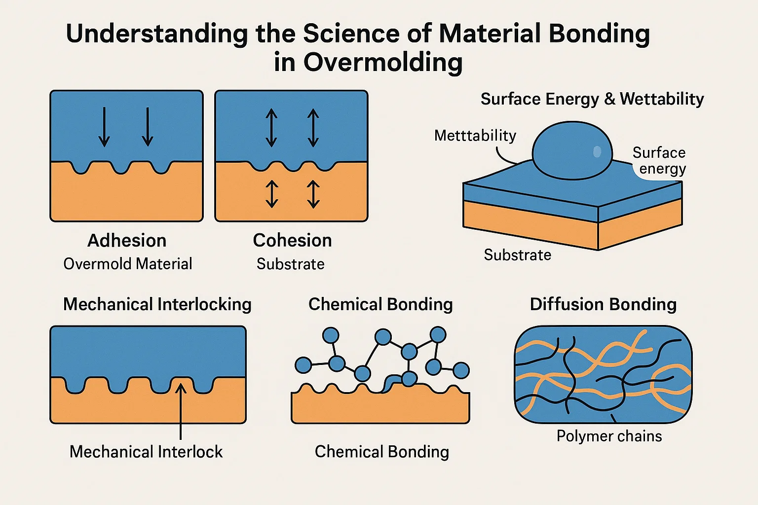ওভারমোল্ডিংয়ে স্থায়ী বন্ধন অর্জন যাদু নয়; এটি একটি বিজ্ঞান যা মূলত কোনও মাইক্রোস্কোপিক স্তরে ইন্টারঅ্যাক্ট করে। সত্যই ওভারমোল্ডিংয়ে মাস্টার করার জন্য, আমাদের এর মৌলিক নীতিগুলি উপলব্ধি করতে হবে আঠালো এবং সংহতি , এবং কীভাবে তারা আপনার স্তর এবং অতিরিক্ত পরিমাণে উপাদানগুলির মধ্যে ইন্টারফেসে প্রয়োগ করে।
