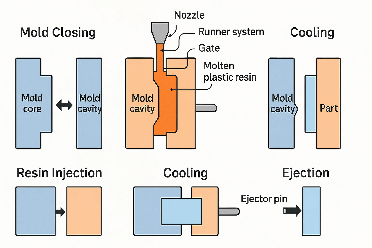 রজন ইনজেকশন: গলিত প্লাস্টিকের রজন একটি অগ্রভাগের মাধ্যমে এবং ছাঁচের মধ্যে উচ্চ চাপের মধ্যে ইনজেকশন করা হয়। উপাদান মাধ্যমে ভ্রমণ রানার সিস্টেম এবং গেট - যা গহ্বরের অর্ধেক অংশ - এবং মূল এবং গহ্বরের মধ্যে স্থান পূরণ করে। মূলটি অংশের অভ্যন্তরীণ আকার গঠনের জন্য রজনকে স্থানচ্যুত করে, যখন গহ্বরটি বাইরের শেল গঠন করে।