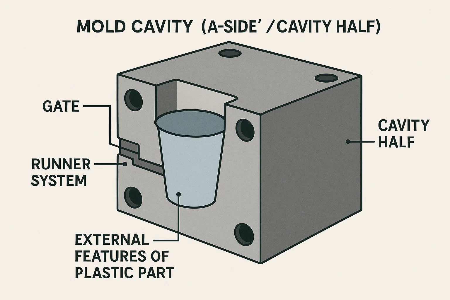 গহ্বর: গহ্বরটি সেই দিকটি যা সাধারণত থাকে গেট এবং রানার সিস্টেম , যা গলিত প্লাস্টিককে ছাঁচের মধ্যে নির্দেশ দেয়। এর প্রাথমিক ভূমিকা হ'ল ইনজেকশনযুক্ত উপাদান গ্রহণ করা এবং বাইরের শেল গঠন করা।