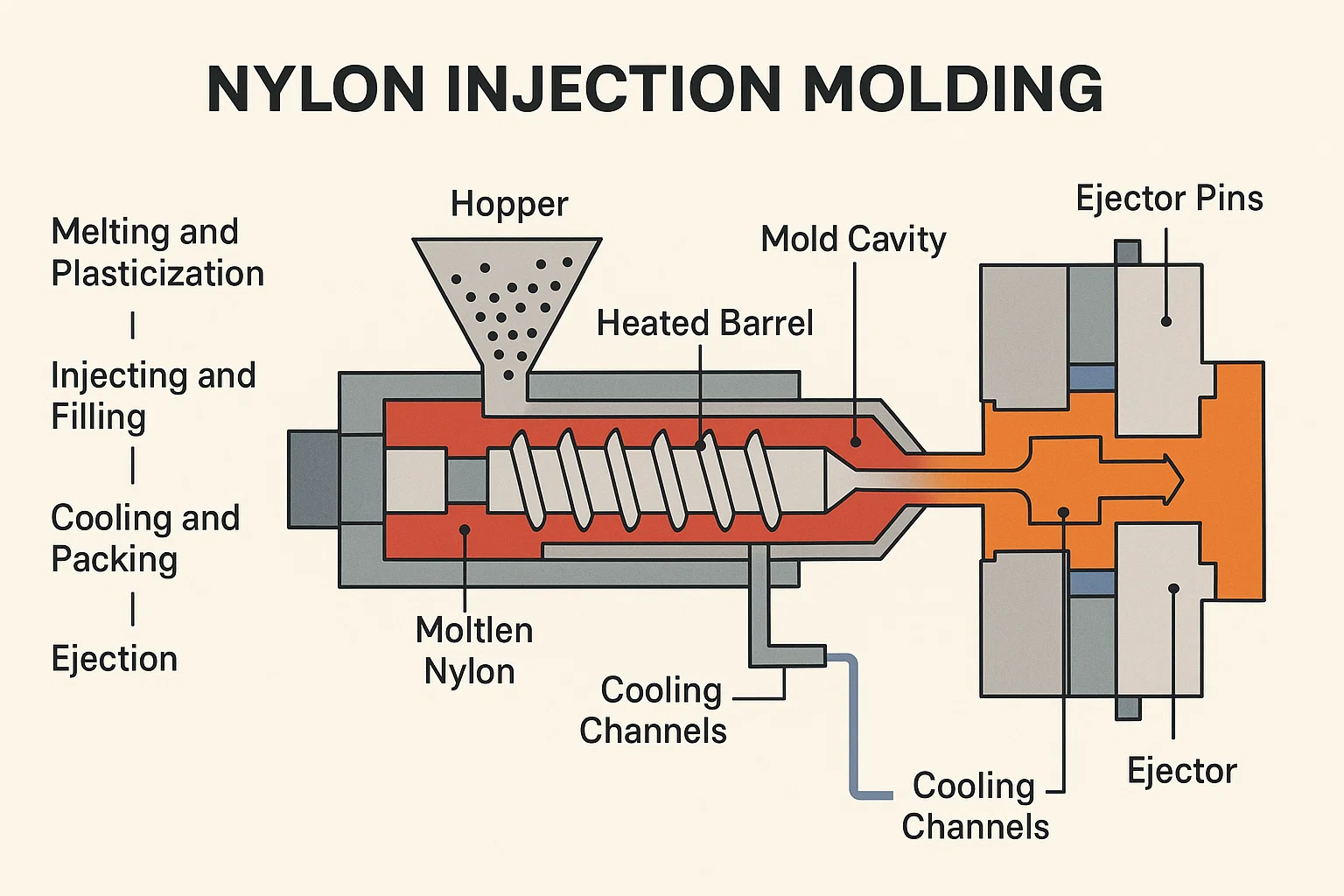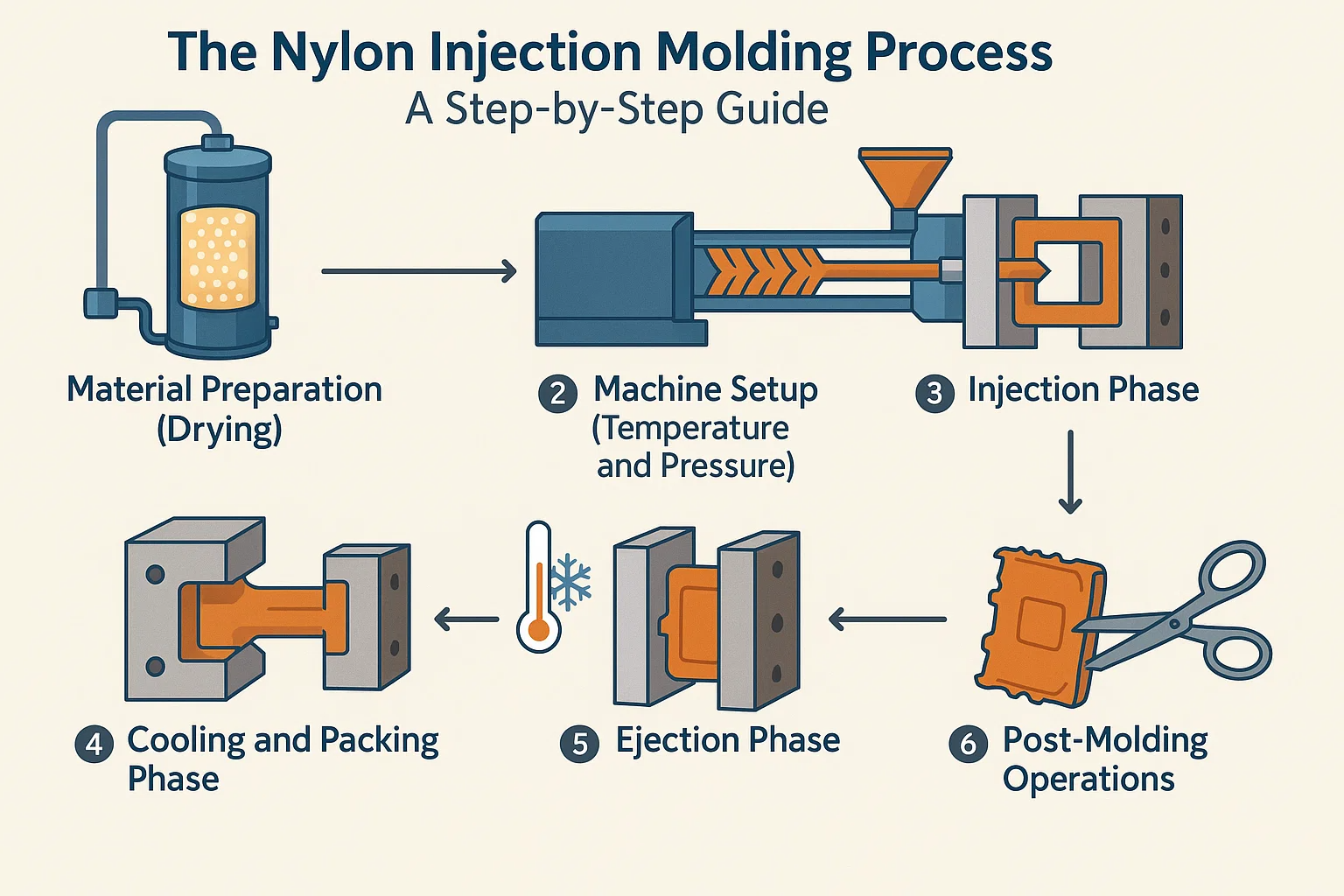 প্রক্রিয়াটি মৌলিকভাবে অন্যান্য প্লাস্টিকের ইনজেকশন ছাঁচনির্মাণের অনুরূপ, তবে নাইলনের অনন্য উপাদান বৈশিষ্ট্যের (বিশেষ করে উচ্চ গলনাঙ্ক এবং হাইগ্রোস্কোপিক প্রকৃতি) এর কারণে তাপমাত্রা, আর্দ্রতা নিয়ন্ত্রণ এবং ইনজেকশন চাপের প্রতি বিশেষ মনোযোগ প্রয়োজন।