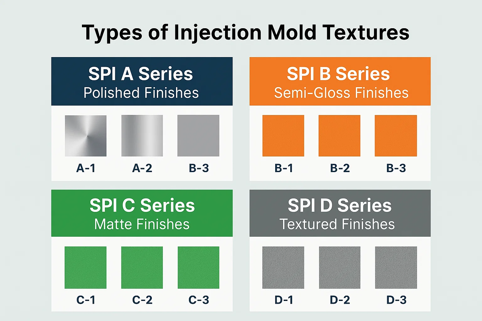 ইনজেকশন ছাঁচের টেক্সচারের জগতটি বিশাল, তবে এটি সোসাইটি অফ প্লাস্টিক শিল্প (এসপিআই) দ্বারা বিকাশিত একটি সিস্টেম দ্বারা মূলত মানক হয়। কোনও অংশের জন্য প্রয়োজনীয় সঠিক সমাপ্তি নির্দিষ্ট করার জন্য এই মানগুলি বোঝা গুরুত্বপূর্ণ।