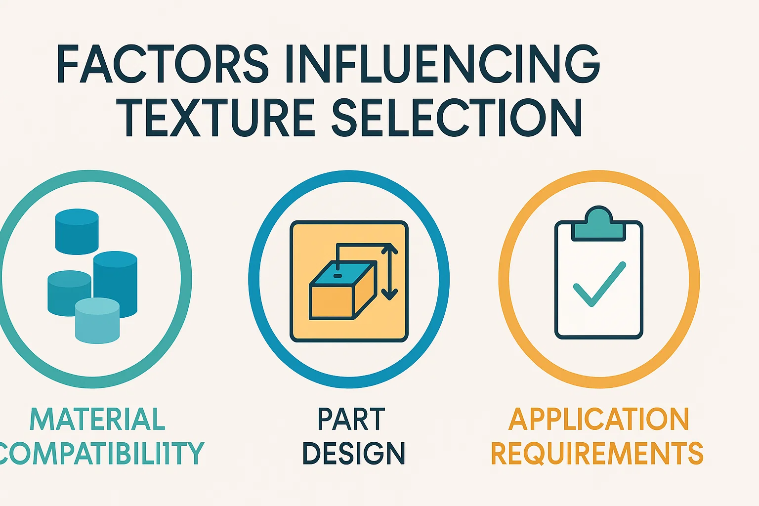একটি অংশের জন্য সঠিক ছাঁচের টেক্সচার নির্বাচন করা একটি সমালোচনামূলক সিদ্ধান্ত যা নান্দনিকতা, কার্যকারিতা এবং উত্পাদন সীমাবদ্ধতার ভারসাম্য বজায় রাখে। বাছাই প্রক্রিয়াটি খুব কমই এক-আকারের-ফিট-সমস্ত পদ্ধতির এবং তিনটি মূল কারণের উপর নির্ভর করে: অংশের উপাদান, এর নকশা এবং এর চূড়ান্ত প্রয়োগের প্রয়োজনীয়তা।