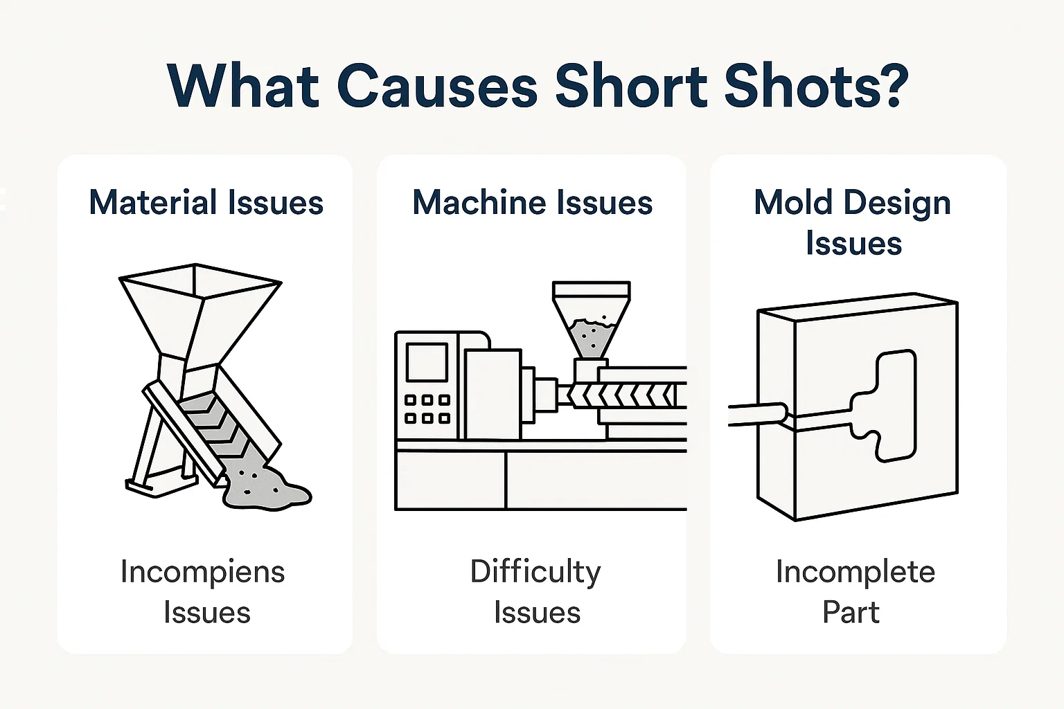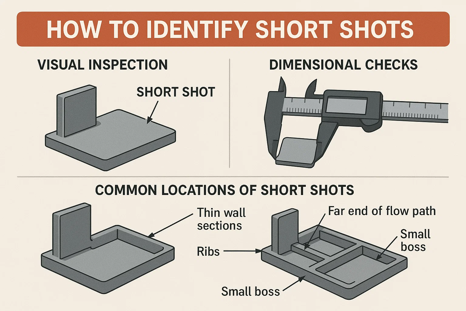 একটি সংক্ষিপ্ত শট নির্ণয়ের জন্য একটি নিয়মতান্ত্রিক পদ্ধতির প্রয়োজন, কারণ কারণটি ইনজেকশন ছাঁচনির্মাণ প্রক্রিয়াটির বিভিন্ন অঞ্চল থেকে শুরু করতে পারে। সর্বাধিক সাধারণ সমস্যাগুলি উপাদান, মেশিন সেটিংস বা ছাঁচের নকশা নিজেই ফিরে পাওয়া যায়।