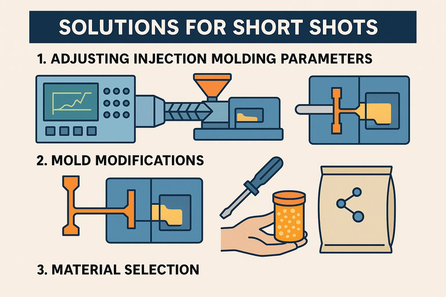 একটি সংক্ষিপ্ত শট সমাধানের জন্য কৌশলগত পদ্ধতির প্রয়োজন। আরও জটিল এবং ব্যয়বহুলগুলিতে যাওয়ার আগে সবচেয়ে সহজ এবং সবচেয়ে ব্যয়বহুল সমাধানগুলি দিয়ে শুরু করা প্রায়শই ভাল। মেশিন সেটিংস দিয়ে শুরু করুন, তারপরে উপাদান বিবেচনা করুন এবং শেষ পর্যন্ত, ছাঁচটি নিজেই দেখুন।